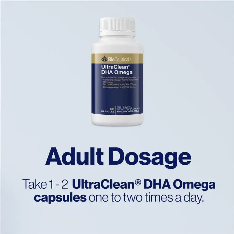 UltraClean® DHA Omega contains a high ratio of DHA to EPA. DHA is highly concentrated in brain cells and maintains brain health and function as well as supporting cognitive function. UltraClean® DHA Omega maintains DHA and EPA levels in breastfeeding women and supports healthy foetal development. Part of BioCeuticals range of brain health supplements.