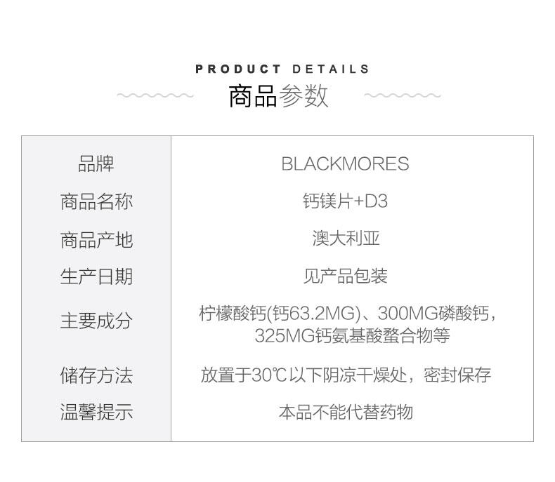 Blackmores 活性钙镁+维生素D3片含有的钙和镁的配方比例是2:1,是最理想的组合配方比率。含有维生素D3、维生素K1及矿物质以帮助人体更好的吸收钙质。钙是人体含量最多的矿物质,人体99%的钙都存在于骨骼中。钙的主要作用是重建与维持骨骼和牙齿。钙同时也作用于新陈代谢,比如神经传输,肌肉收缩以及调节心肌功能。钙和镁是骨骼健康的必要元素,同时在肌肉和神经功能重起着重要作用。本产品是符合需求比例的,按照钙和镁2:1维生素D是帮助钙吸收与运用的必要元素。维生素D不足,也会导致骨强度和骨密度下降,以及关节疼痛。