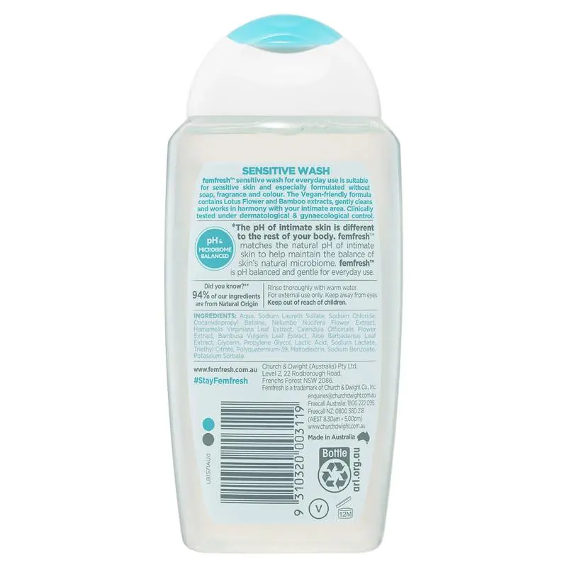 Discover the gentle touch of Femfresh Sensitive Intimate Wash, specially crafted for your delicate intimate skin. This vegan-friendly formulation is infused with nourishing Lotus Flower and Bamboo extracts, providing a soft, soothing cleanse that works in sync with your body’s natural harmony. It’s a soap-free, fragrance-free, and colour-free wash, ensuring it’s ideal for those with sensitive skin. Made with 94% Natural Origin ingredients, this nurturing wash has been dermatologically and gynaecologically tested to ensure and its suitability for daily use.