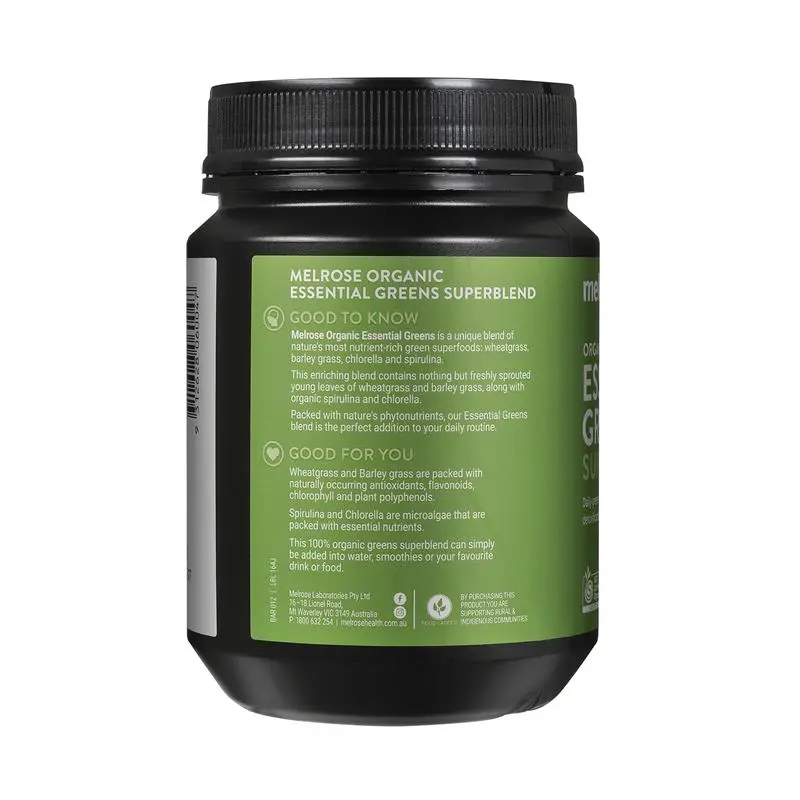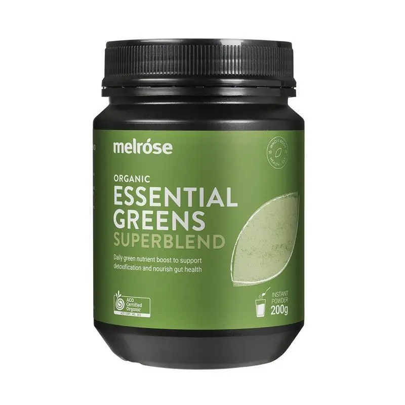 Melrose Organic Essential Greens is a combination of some of nature’s most nutrient-rich green superfoods: wheatgrass, barley grass, chlorella and spirulina. This daily blend of alkaline green powders supports detoxification and is packed with phytonutrients including chlorophyll.