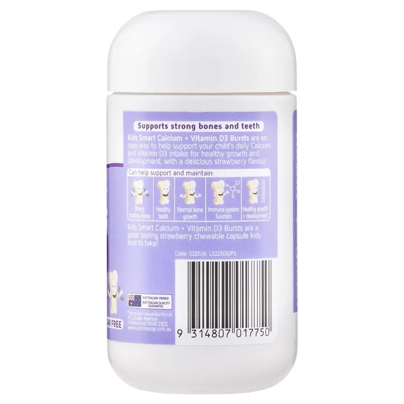 Kids Smart Calcium + Vitamin D3 Bursts are lactose free and an easy way to help support your child’s daily Calcium and Vitamin D3 intake for healthy growth and development, with a delicious strawberry flavour.