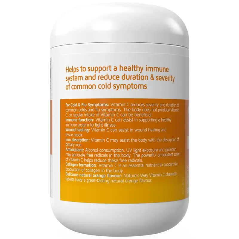 Nature’s Way Vitamin C 500mg Sugarless is a Vitamin C formula in a convenient chewable tablet with a delicious natural orange flavour. Helps to support a healthy immune system and reduce duration & severity of common cold symptoms.