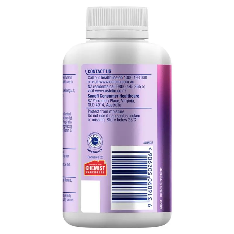 Support bone strength and muscle function with Ostelin Vitamin D3 1000IU Capsules 300. Ostelin Vitamin D3 1000IU Capsules provide 25 micrograms of colecalciferol (Vitamin D3 1000IU). Vitamin D3 enhances calcium absorption to support bone mineralisation and maintains muscle function. Additionally Ostelin Vitamin D3 1000IU supports healthy immune function and maintains general well-being. Ostelin is Australia’s #1 Bone Health brand^. Australian Made® and Halal Certified with high-quality ingredients and rigorously tested to ensure quality, potency, and purity, Ostelin Vitamin D3 1000IU Capsules contain no added gluten, lactose, sugar, artificial colours, artificial flavours, artificial sweeteners, or dairy products.* For adults and children over 12 years of age: Take 1 easy-to-swallow capsule daily with a meal, or as directed by your healthcare professional. Always read the label and follow the directions for use. Vitamin supplements should not replace a balanced diet.