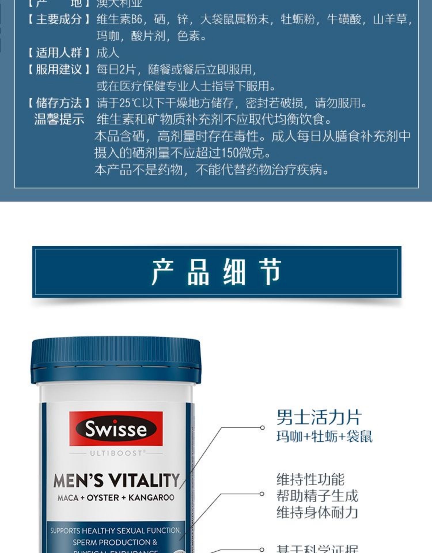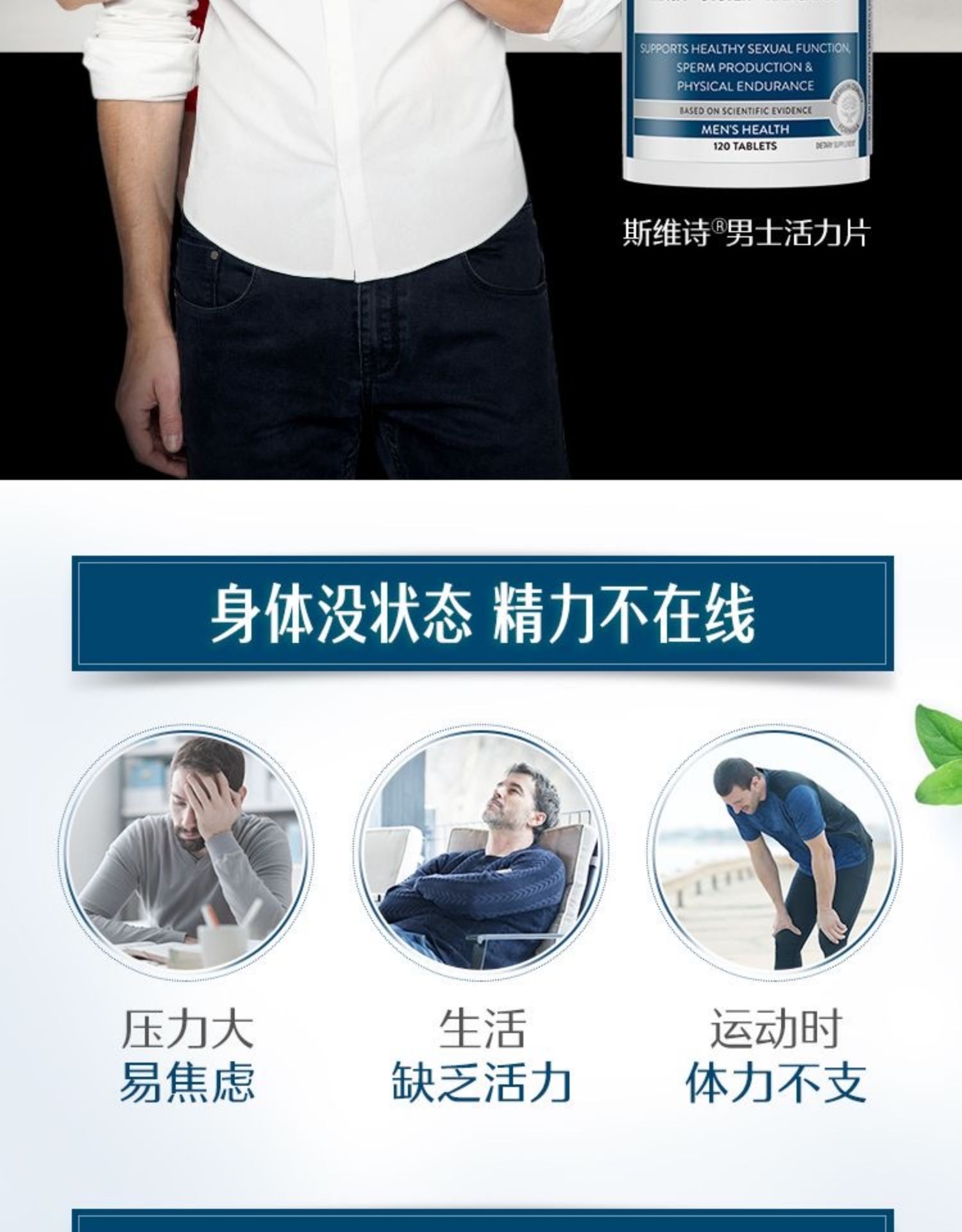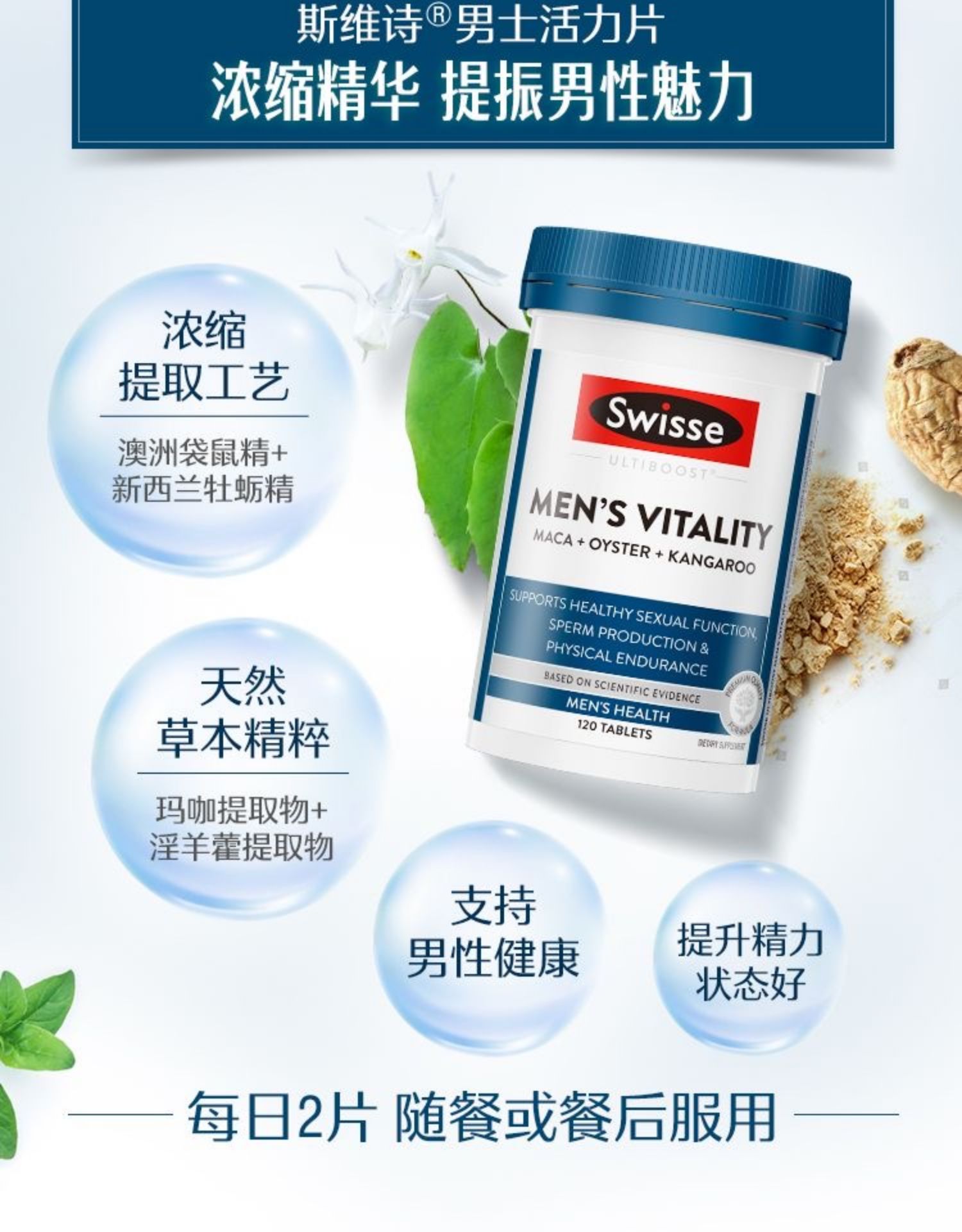 一句话产品卖点:浓缩提取工艺,天然草本精粹,支持男性健康,提升精力状态好 – 用法用量:每日2粒,随餐或餐后服用 – 适宜人群:压力大、易焦虑,生活缺乏活力,运动体力不支的男性